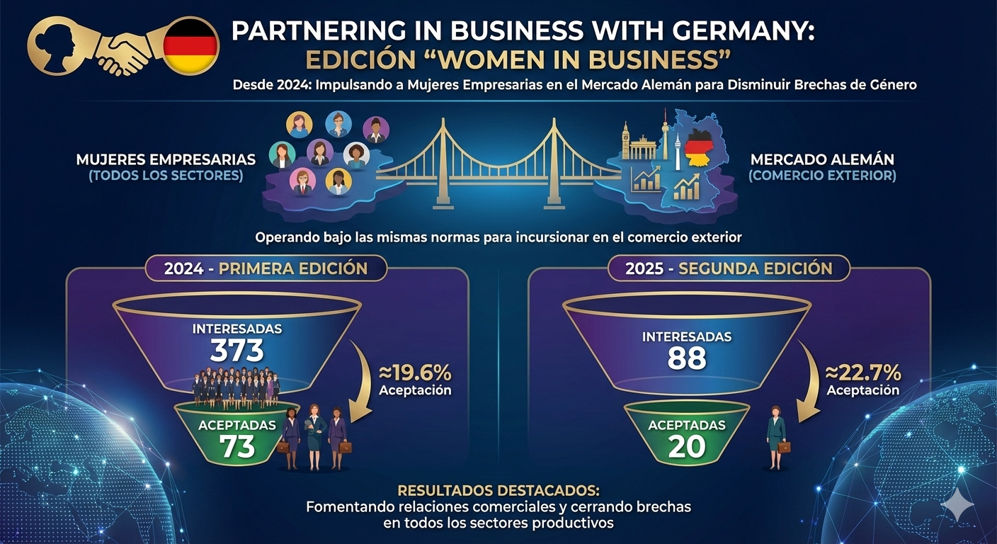 Partnering in Business With Germany, desde el 2024 lanzó una edición exclusivamente para mujeres empresarias nombrada “Women in Business” para que más mujeres logren establecer relaciones comerciales en el mercado alemán operando bajo las misma normas del programa original, para disminuir las brechas de género e incursionen en el comercio exterior para todos los sectores productivos. A continuación destacamos los siguientes resultados: